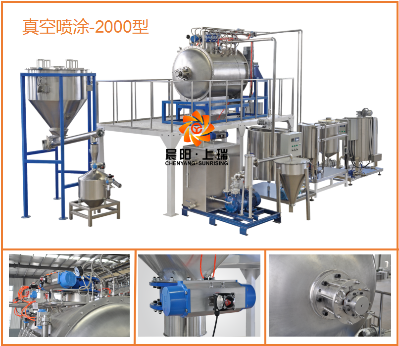 真空噴涂使用晨陽(yáng)自行研發(fā)的第三代真空噴涂機,該真空噴涂系統目前使用臥式單軸漿葉混合機,該機比較適合2噸生產(chǎn)線(xiàn)的產(chǎn)品配置使用,具有高性?xún)r(jià)比的使用效果。密封閥門(mén)使用進(jìn)口配置,機械密封使用合資配置,減速機使用硬齒面減速機,食品接觸完全304材質(zhì)。真空狀態(tài)下噴涂油脂含量可以到30%,真空壓力達0.095mpa,動(dòng)態(tài)狀態(tài)下保壓0.09mpa堅持10分鐘在以上。配置水冷真空泵。油脂,風(fēng)味劑都是在真空狀態(tài)下完成,油脂獨立稱(chēng)重系統,膏狀風(fēng)味劑,獨立稱(chēng)重系統,不同液態(tài)使用不同的輸送泵,晨陽(yáng)公司自行編輯的運行軟件在第三代真空噴涂已經(jīng)實(shí)現完全自動(dòng)化,穩定化,參數可視化,重要部位數據監視報警,數據存儲,配方留檔等強大功能。