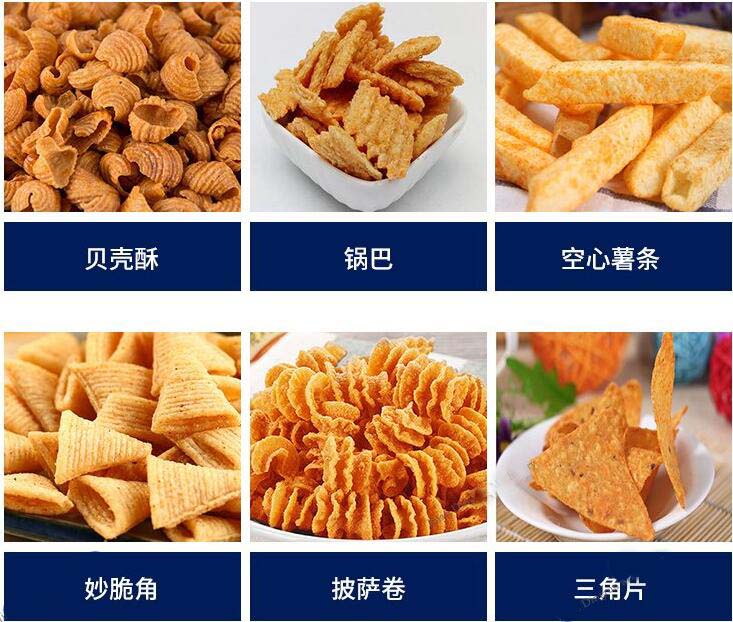 成型和切斷:通過成型機和切斷機將膨化后的物料成型并切斷成所需的形狀,如三角、小葫蘆、小魚、牛角等