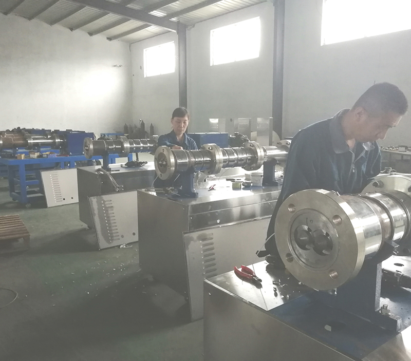 (2)擠出系統: 由螺桿,機筒,連接段組成; 螺桿為38crmoal材料,滲氮深度5mm,耐磨耐用,機筒為國標45號鋼,與螺桿配合間隙控制在0.5mm以?xún)?br />