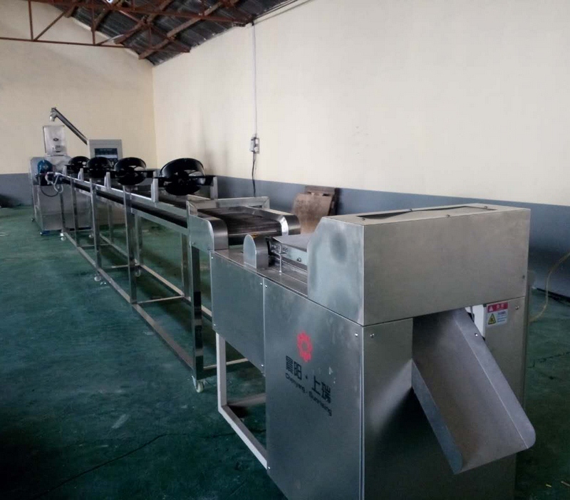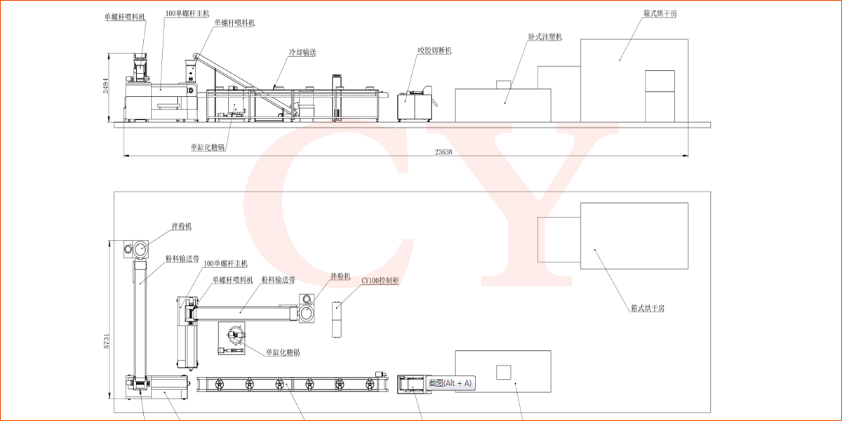 拌粉機→螺旋上料機→單螺擠出機→8米冷卻機→伺服切斷機