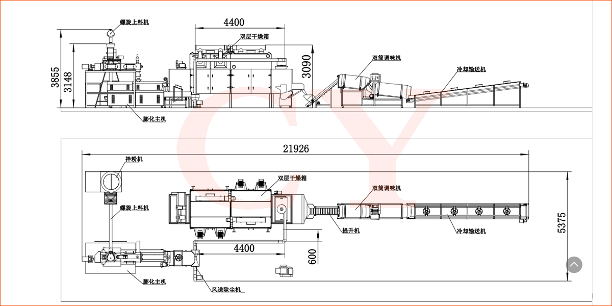 原料混合-(調制)膨化--烘干-噴油調味-冷卻-包裝