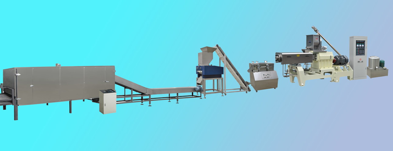 原料混合-擠壓膨化-冷卻-切斷-粉碎-篩選-除塵-烘干