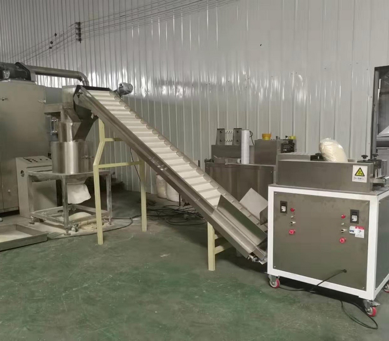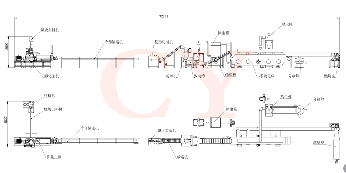 拌粉機→螺旋提料機→膨化主機→冷卻輸送-切斷機→提升機-粉碎機-除塵機-篩選機-提升機-震動(dòng)硫化床