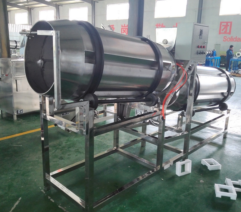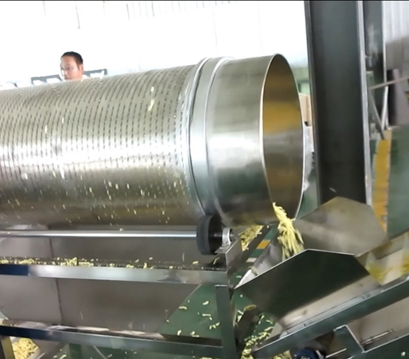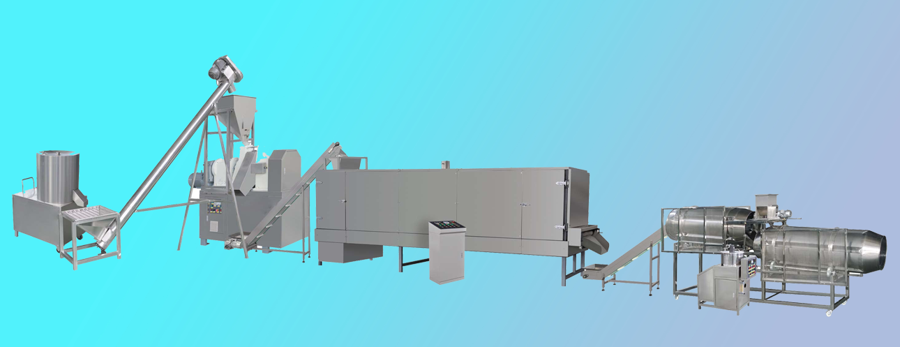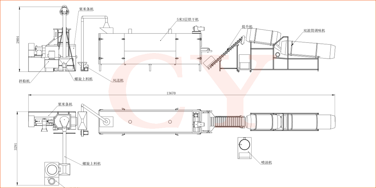 拌粉機→膨化機→提升機-一滾篩-提升機-連續油炸機-振動(dòng)脫油機--單滾筒調味機-調味機