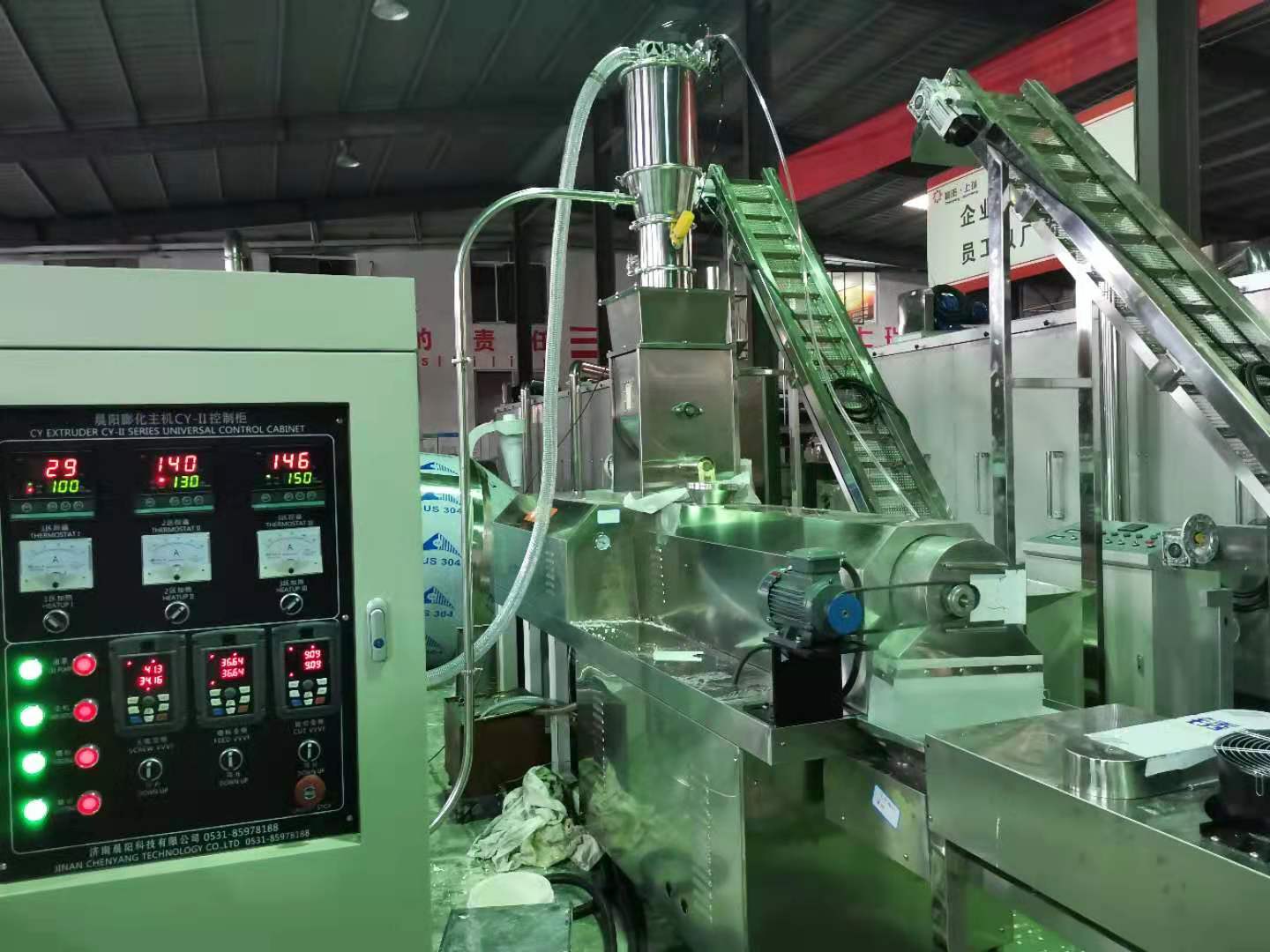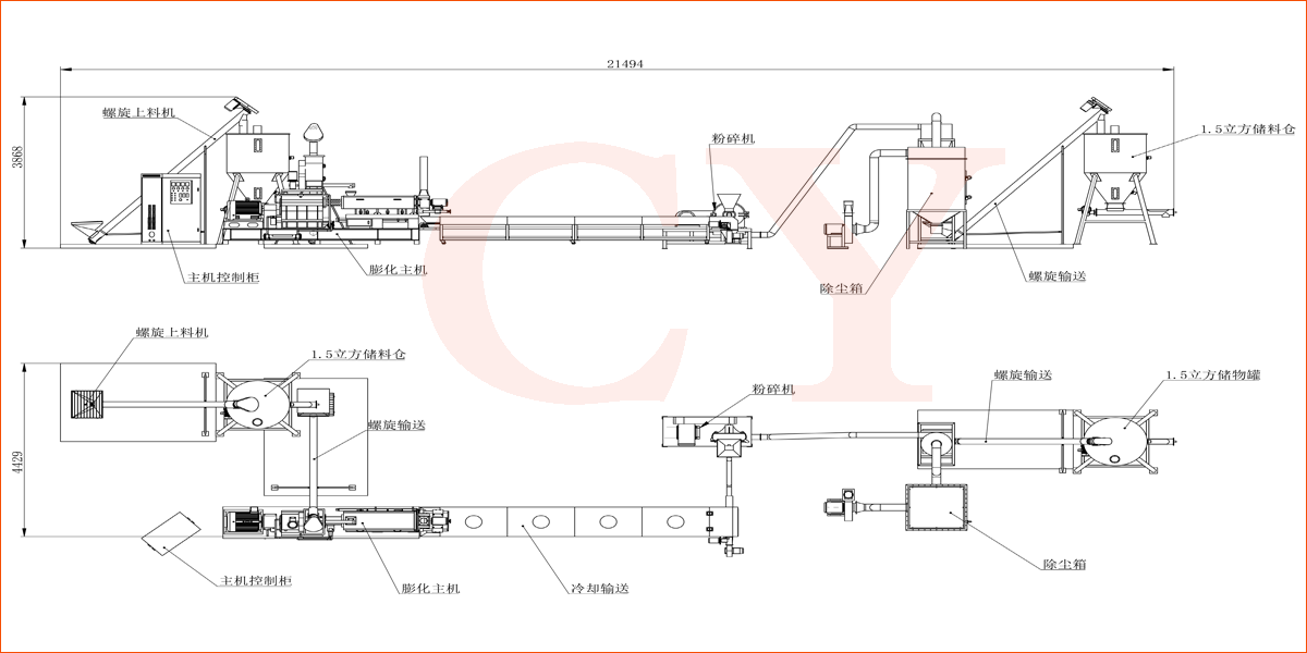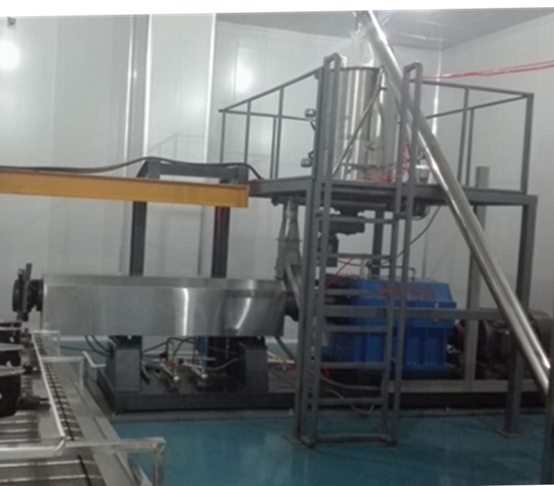 拌粉機→螺旋提料機→膨化主機→風(fēng)送機→烘干機→除塵粉碎機→批次式混合機→包裝機
