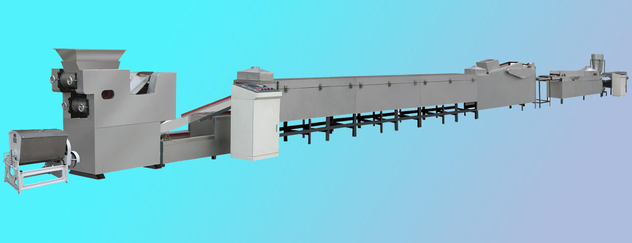 和面機→壓面機→蒸煮切斷機→油炸機→冷卻機