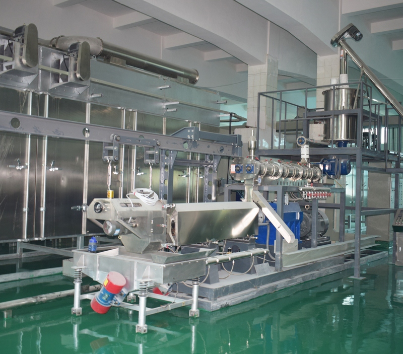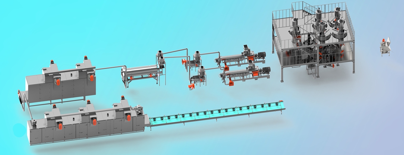 自動(dòng)配料預處理-粉碎-混合-擠壓熟化-均質(zhì)-震動(dòng)烘干-二次烘干-冷卻