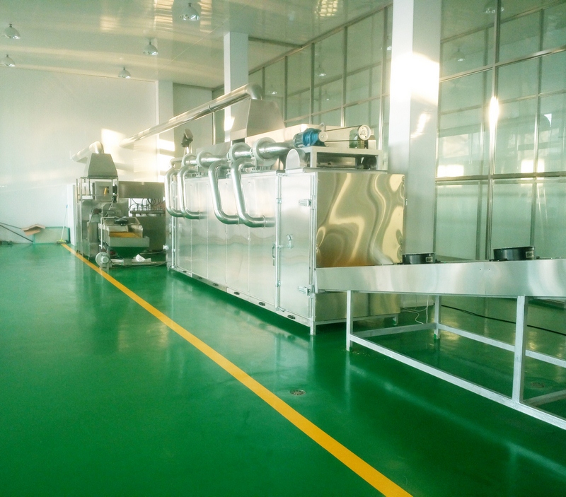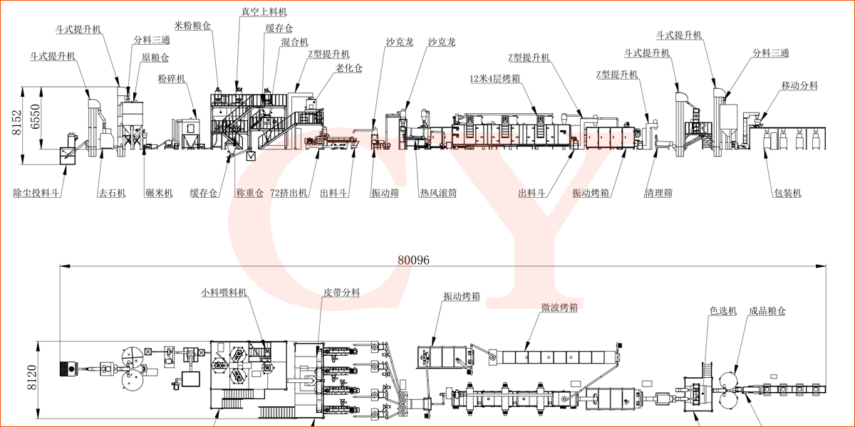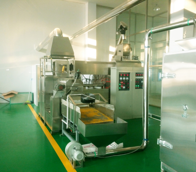 大型生產(chǎn)線(xiàn):自動(dòng)配料站→粉碎機→混合機→膨化主機→振動(dòng)篩-風(fēng)送機→均質(zhì)滾筒-風(fēng)送機-多層振動(dòng)烘干機→風(fēng)送機-微波干燥-風(fēng)送機-二次烘干機-風(fēng)送機-多層振動(dòng)冷卻機-Z型提升機-包裝機