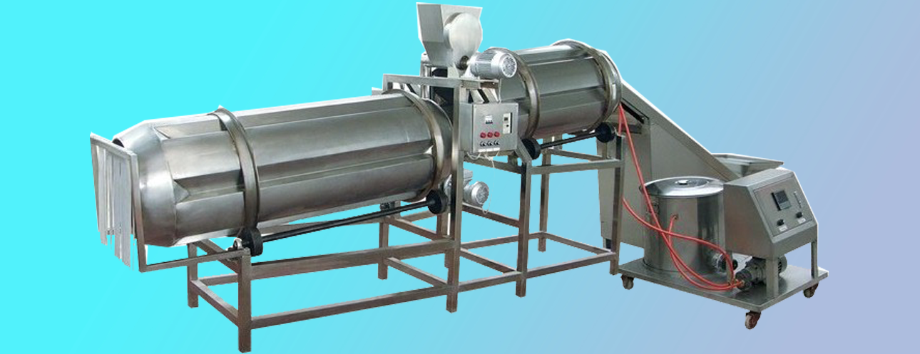 雙滾筒調味設備主要用于休閑膨化食品、寵物食品的表面噴油與調味,具有產(chǎn)量高,可連續作業(yè)等特點(diǎn)。個(gè)滾筒前端先噴油,物料表面有粘性后 在滾筒中端再撒入調味粉,調味粉可以更好的黏附在產(chǎn)品表面。第二滾筒充分混合,使物料表面黏附均勻