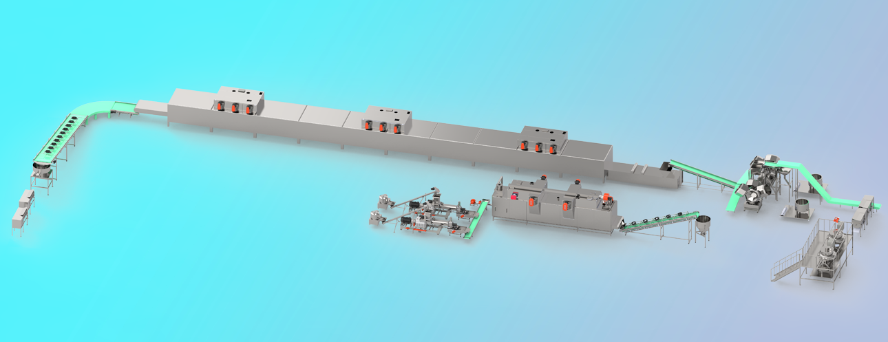 拌粉機→螺旋提料機→膨化主機→提升機→五層烘干機→冷卻機→混合機→熬糖設備→噴糖設備→提升機→單層高溫烘干機→冷卻機→振動(dòng)篩
